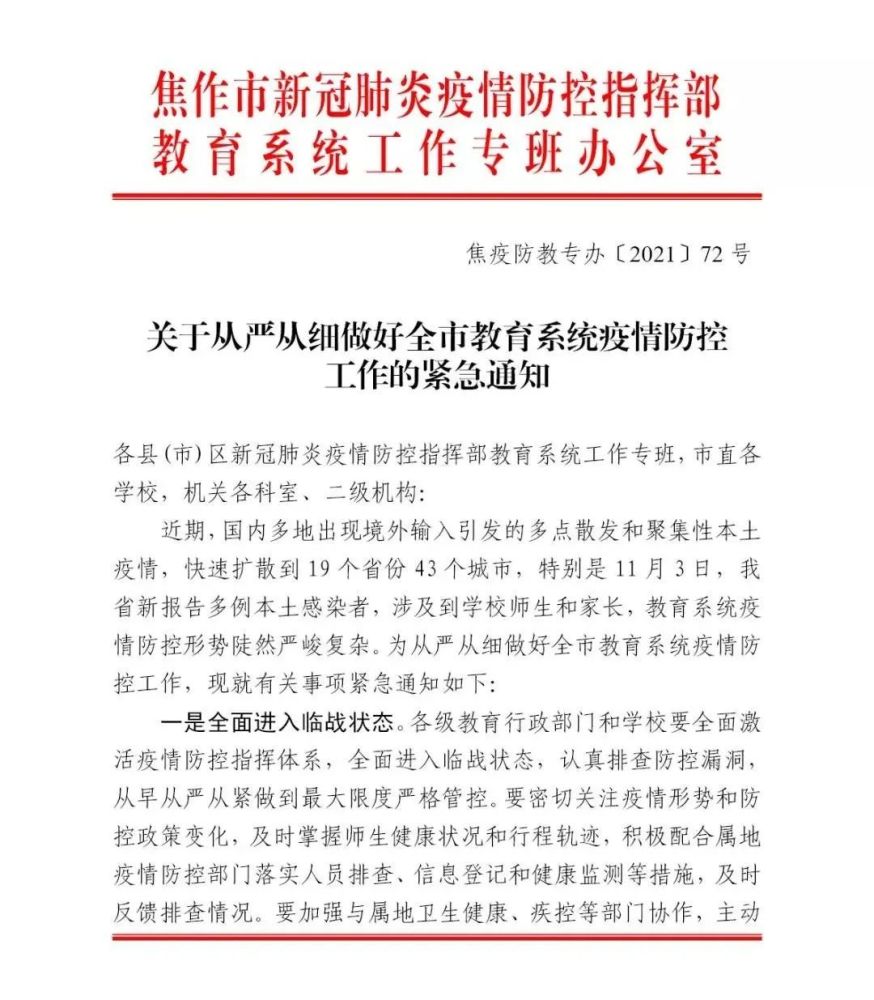 焦作市全面暂停校外培训机构等线下培训活动